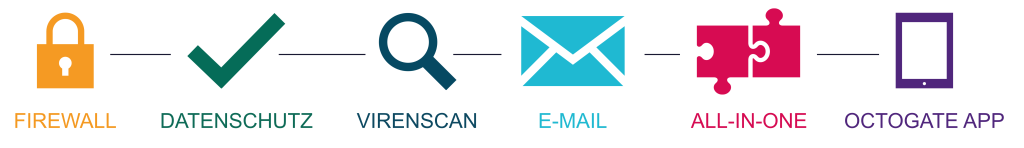 Die OctoGate Medical Cloud Lösung sichert ihr komplette lokales Netzwerk mit Hilfe einer Firewall in der Cloud ab. Nach Installation des lokalen Hardware – Gateways sind alle Geräte dahinter komplett geschützt gegen Hacker und Viren.